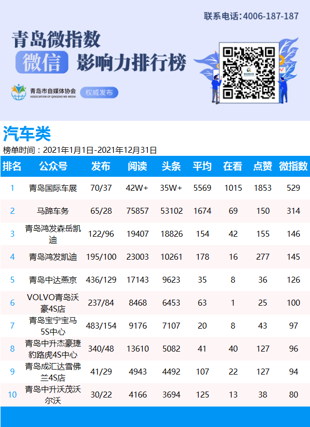 由青岛市自媒体协会联合观海新闻、清博指数平台打造的“青岛微指数微信影响力排行榜”今日发布全年(2021年1月1日-2021年12月31日)榜单。